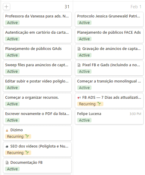 Para além dessas tarefas agendadas, encontra-se também as tarefas recorrentes; aquelas que repetem-se em um determinado período.