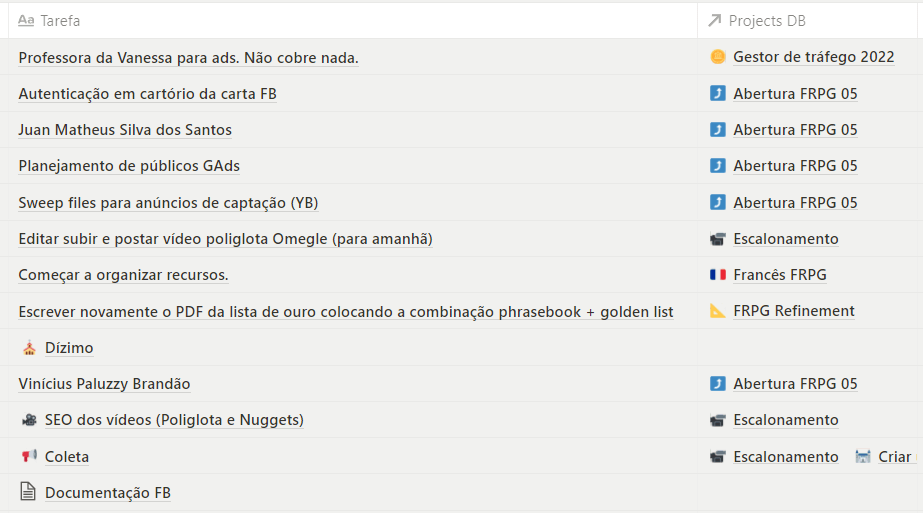 A foto abaixo mostra as mesmas tarefas da foto anterior, mas a coluna da direita demonstra agora os projetos aos quais elas estão ligadas.