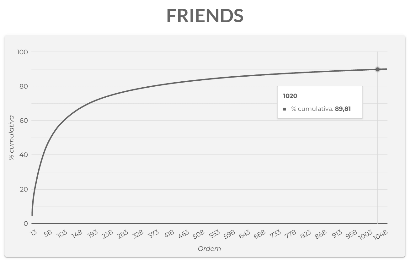 No gráfico abaixo você pode ver que uma pessoa que sabe aproximadamente 950 a 1000 palavras frequentes do inglês, chega a ter uma compreensão média de mais de 88% de absolutamente tudo que é falado na série Friends, série que simula situações do dia a dia.